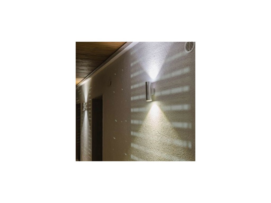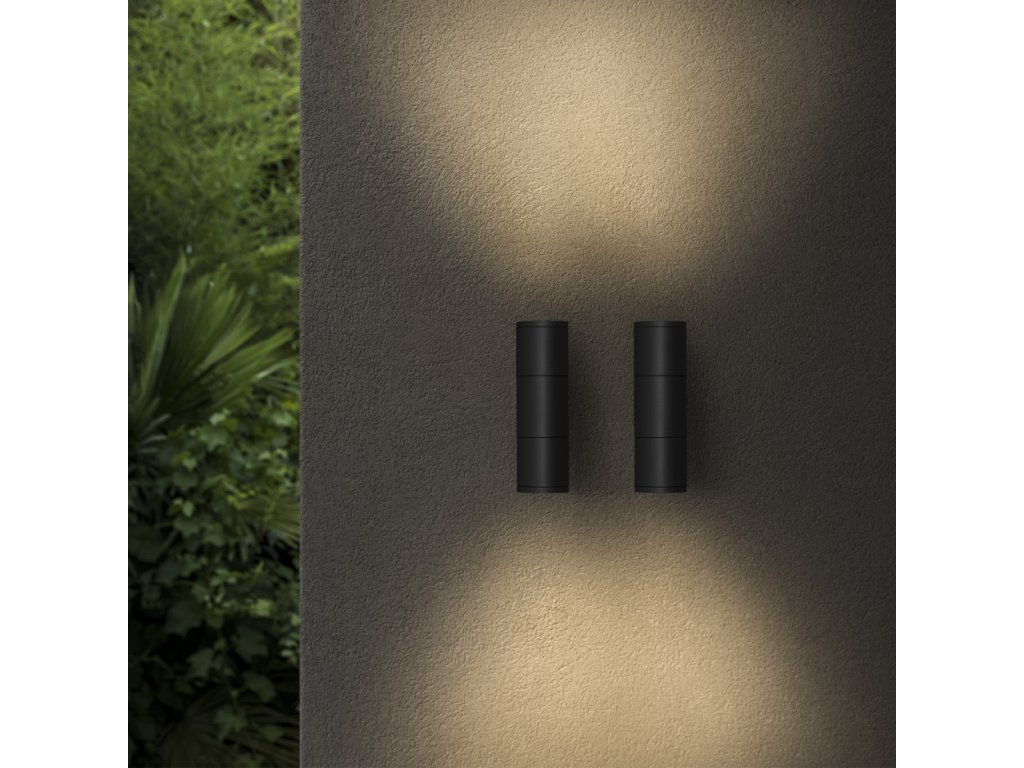 Vkusné nástěnné svítidlo Gun z kolekce venkovního osvětlení italské značky Ideal Lux v kratším provedení o výšce 21 cm. Vemi efektivně nasvítí terasy, balkóny či vchodové dveře. Základna světla je z tlakově litého hliníku s lakovanou povrchovou úpravou. Pod stínidlem, které je z pyrexového skla, je patice GU10 s maximálním příkonem 2 x 35 W. Zdroje nejsou součástí balení. Světlo svítí směrem nahoru i dolů. Pro úsporu elektrické energie a dlouhou životnost doporučujeme použít LED žárovky. Krytí IP44 vyjadřuje voděodolnost a vhodnost do vlhkého venkovního prostředí. Patice GU10 o maximálním příkonu 2 x 35 W, krytí IP44 - vhodné do exteriéru. Nabízeno v provedení bílé, černé barvě, hliník, antracit, kávová a v šedé barvě.
