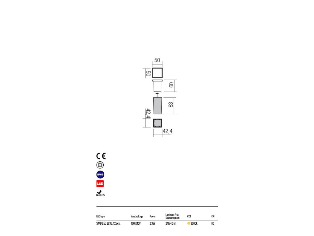 Zapuštěné venkovní bodové svítidlo vybavené LED diodami, pro montáž na stěnu, plastové tělo, opálový polykarbonátový difuzor s krytem z nerezové oceli v bílé nebo černé barvě. Součástí balení je plastová zapuštěná krabice.Doplňkové parametry