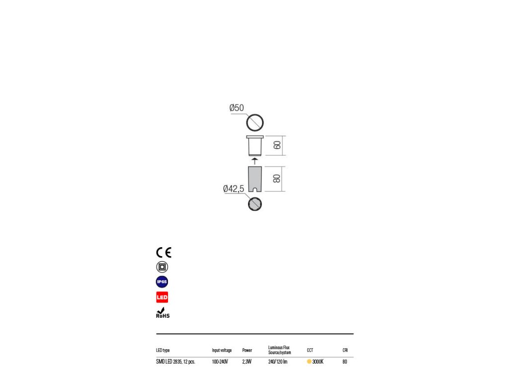Zapuštěné venkovní bodové svítidlo vybavené LED diodami, pro montáž na stěnu, plastové tělo, opálový polykarbonátový difuzor s krytem z nerezové oceli v bílé nebo černé barvě. Součástí balení je plastová zapuštěná krabice.Doplňkové parametry