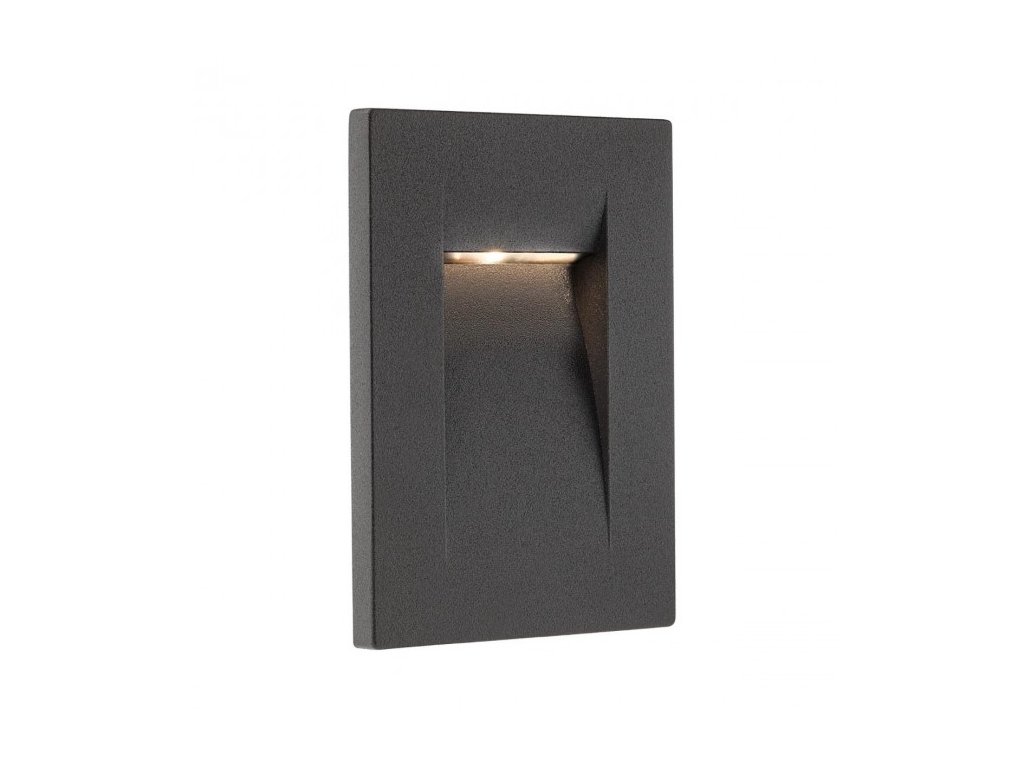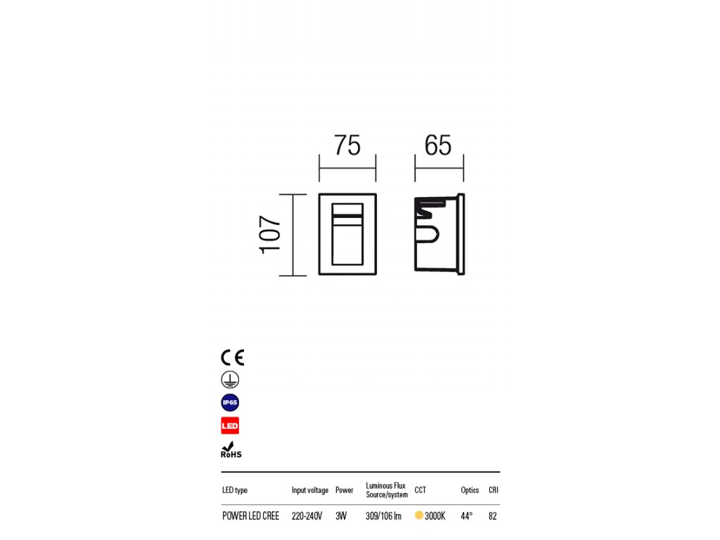 Venkovní nebo interiérové zápustné nástěnné svítidlo s asymetrickým osvětlením, vyrobeno z hliníkové slitiny. Obsahuje POWER LED 1x3W. Součástí svítidla je napáječ.Parametry produktu: