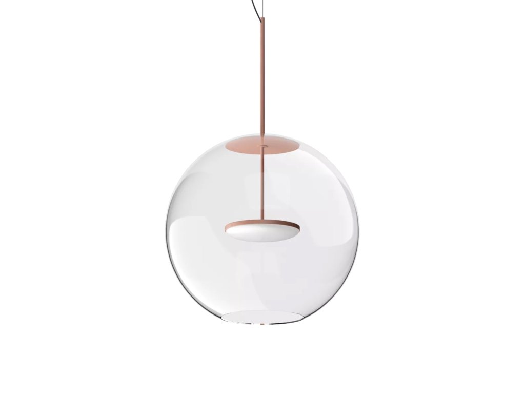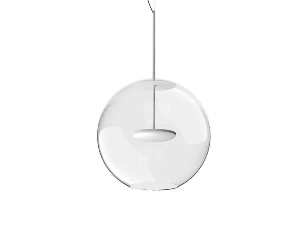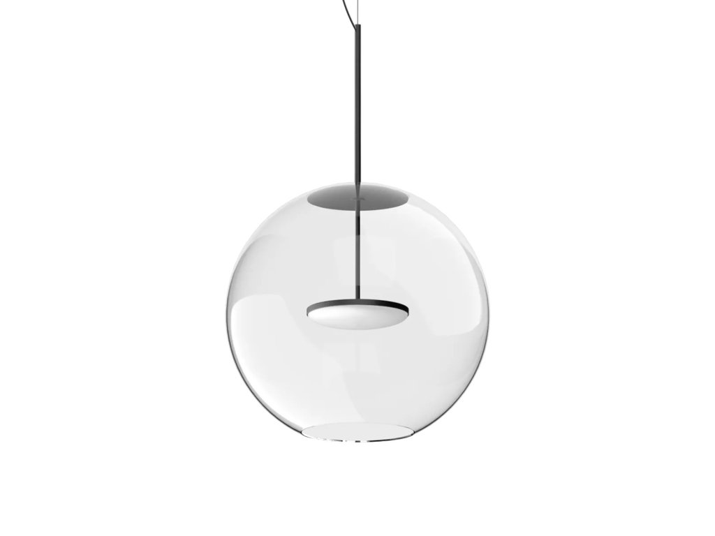 Cristalbolla_P je závěsné svítidlo, které kombinuje čisté linie s působivým světelným výkonem. Hliníkový rám a tělo mají strukturovaný lakovaný povrch, který je k dispozici v barvách bílá, černá, broskvová, petrolejová a tmavě modrá, aby dokonale doplňoval jakýkoli styl interiéru, od minimalistického po sofistikovaný. Ústředním prvkem designu je sférický difuzér z průhledného skla, který zvyšuje čistotu světla a vytváří elegantní, přirozené odrazy. Svítidlo doplňuje lakovaný kovový kryt, barevně sladěný s tělem lampy, který zajišťuje vizuální harmonii a pečlivou pozornost k detailům.