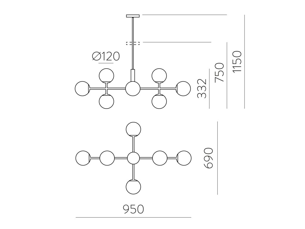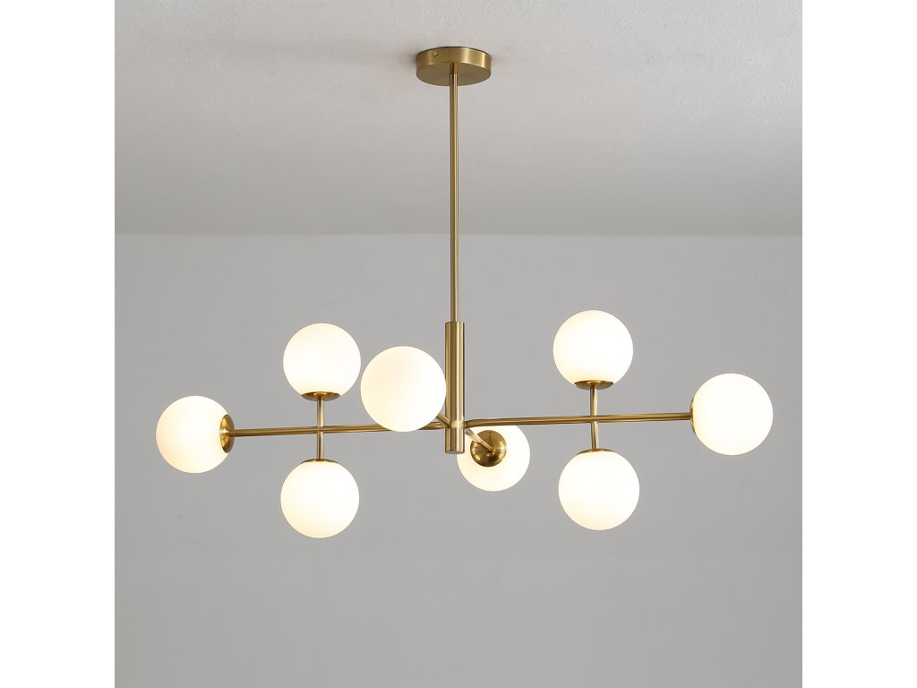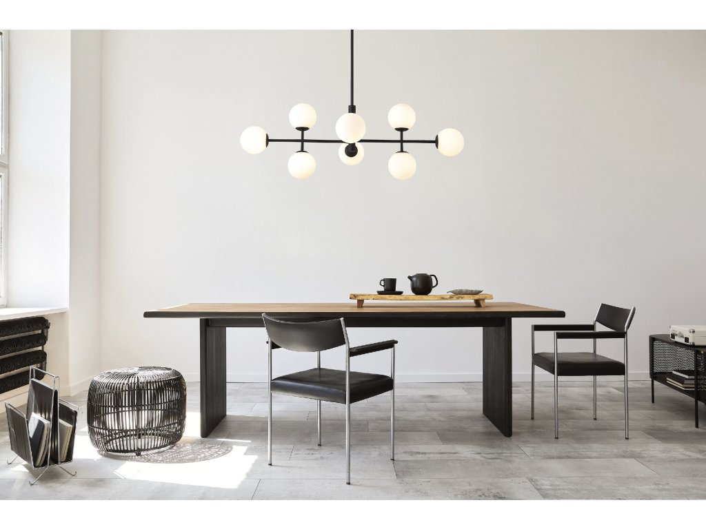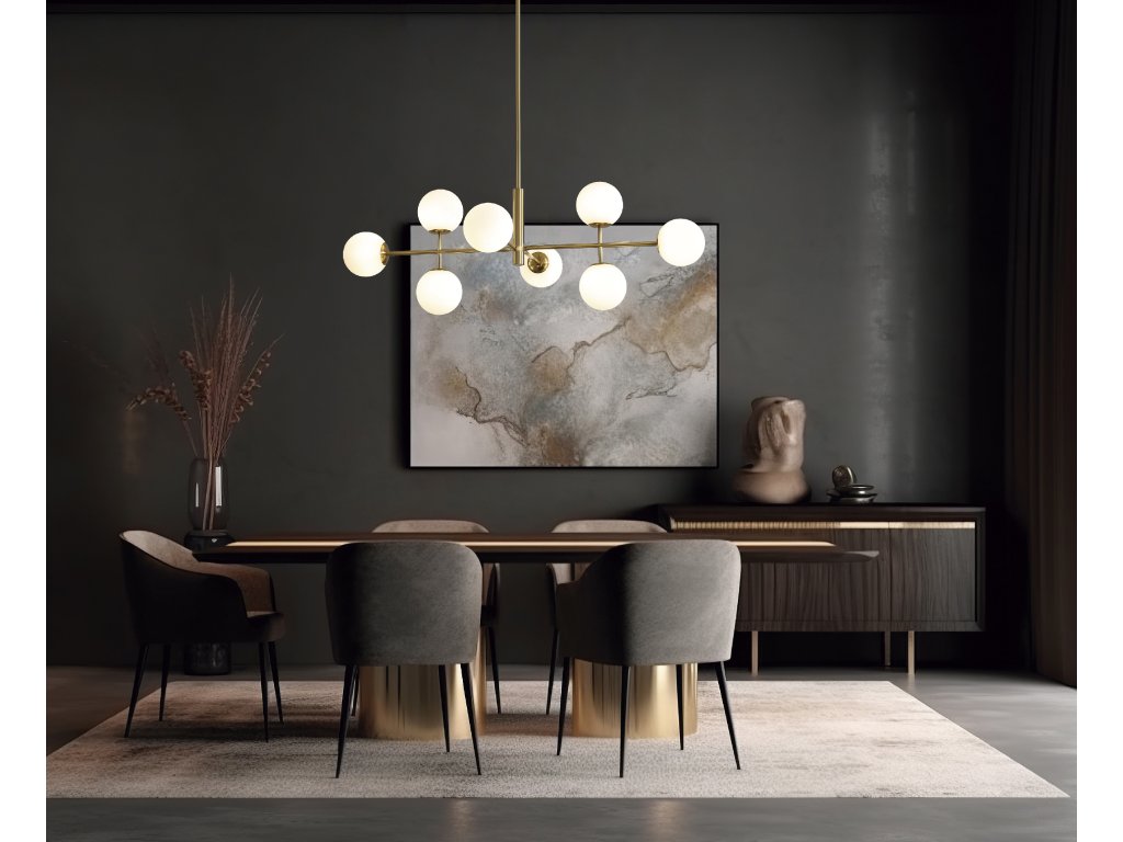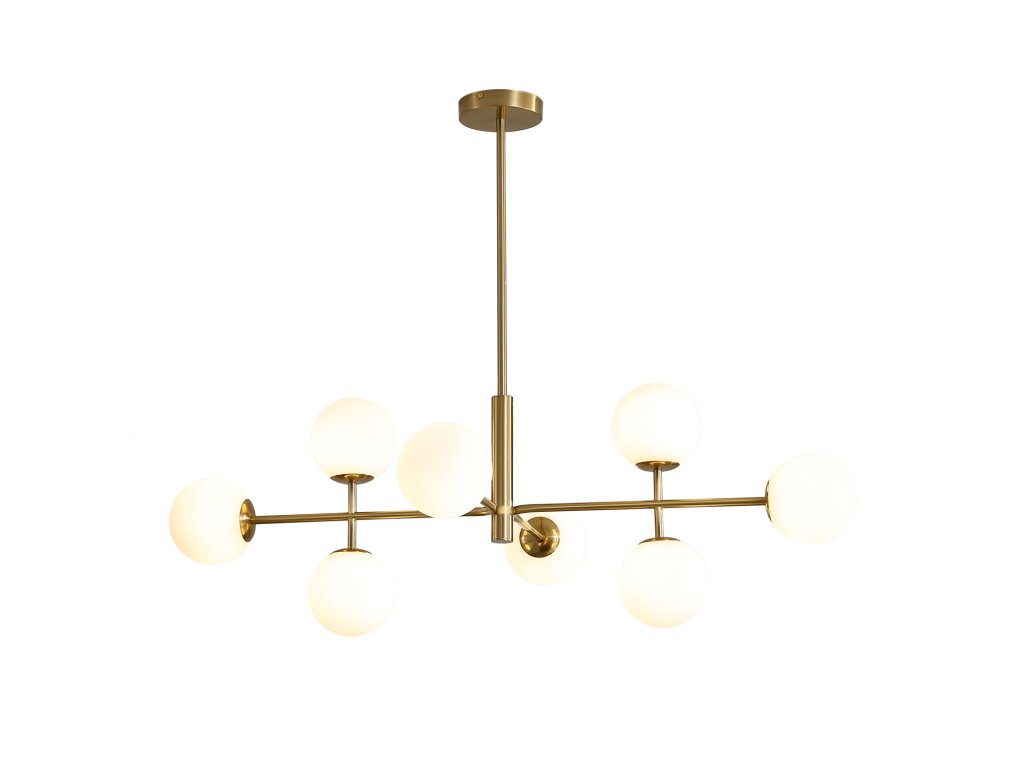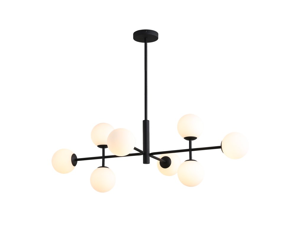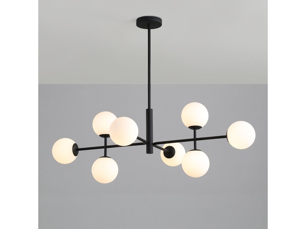 Moderní závěsné LED svítidlo DORIS se skládá z kulaté rozety na níž je připevněn lineární kovový stonek, ze kterého jdou kovové paprsky zdobené několika opálově bílými skleněnými difuzory ve tvaru koule.