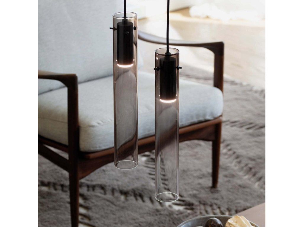 Designové závěsné LED svítidlo FLAM z kovu s práškovou povrchovou úpravou v černé barvě. Difuzor z borosilikátového skla. Černý PVC kabel. Varianty difuzoru: čirý, čirý s kouřovým přechodem nebo plně kouřový. Výška svítidla činí 270 cm a průměr 6 cm. Vyzařuje světlo se svítivostí 900 lm a s teplotou chromatičnosti 3000 K. Integrovaný LED zdroj o příkonu 1 x 10 W, který má životnost až 30 000 hodin. Krytí IP20 je vhodné pro použití do interiéru. Například nad jídelní stůl či do obývacího pokoje.
