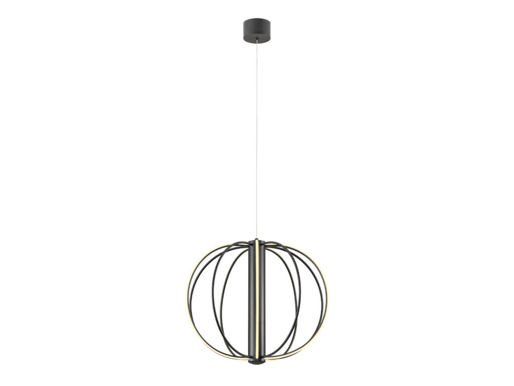 Závěsné vnitřní osvětlení vybavené SMD LED diodami, stmívatelné pomocí TRIAC, hliníková a kovová konstrukce lakovaná v matné černé barvě, opálově bílý silikonový difuzor.