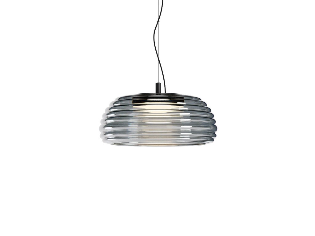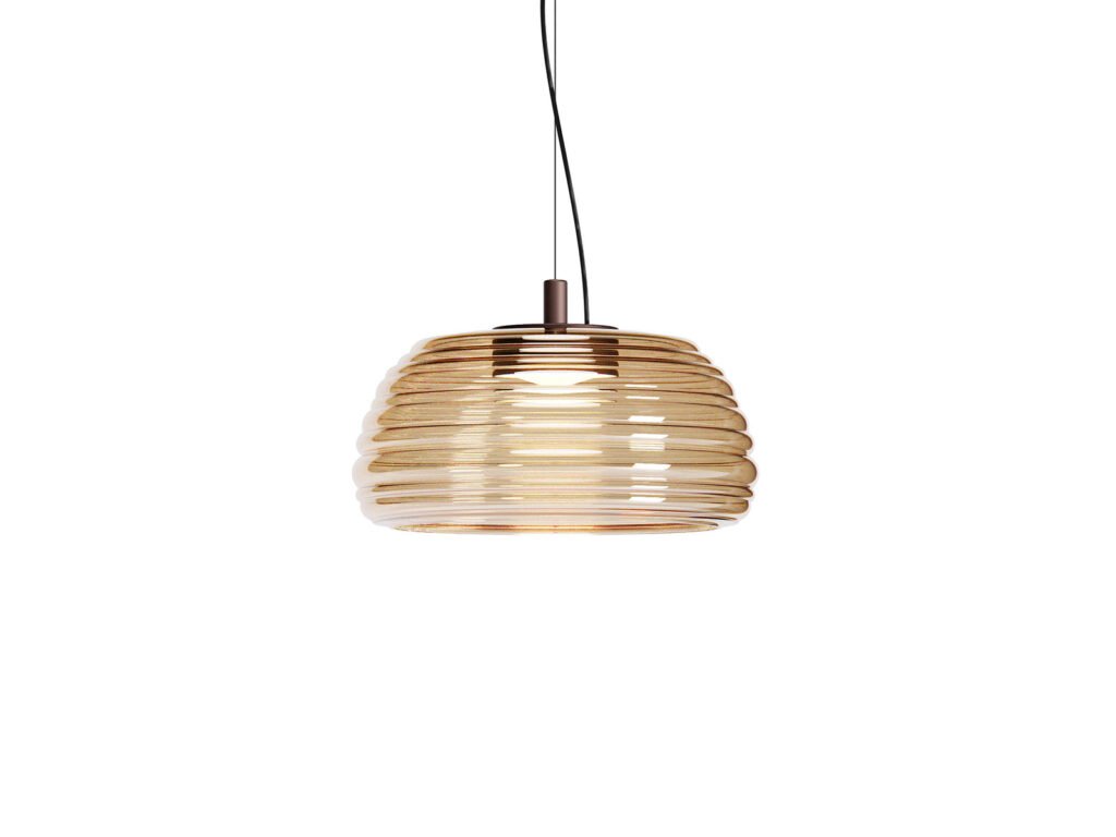 Závěsné vnitřní osvětlení, vybavené SMD LED diodami s možností volby barevné teploty, stmívatelné. Kovová konstrukce v matné kávové barvě, difuzor z jantarového skla.