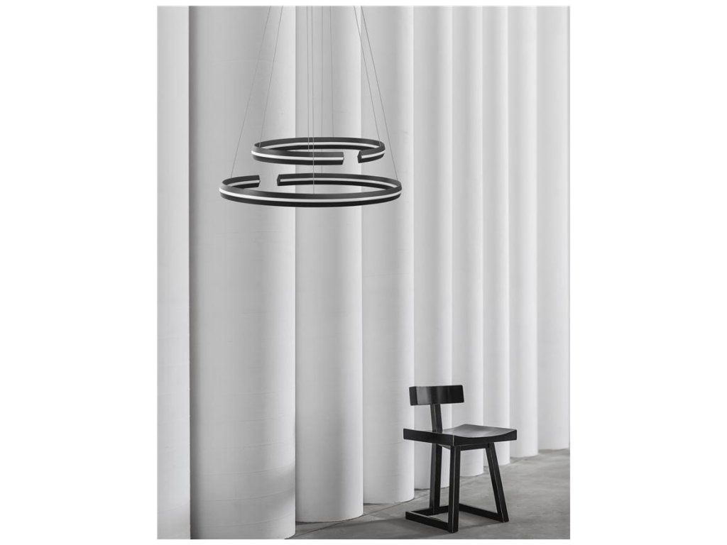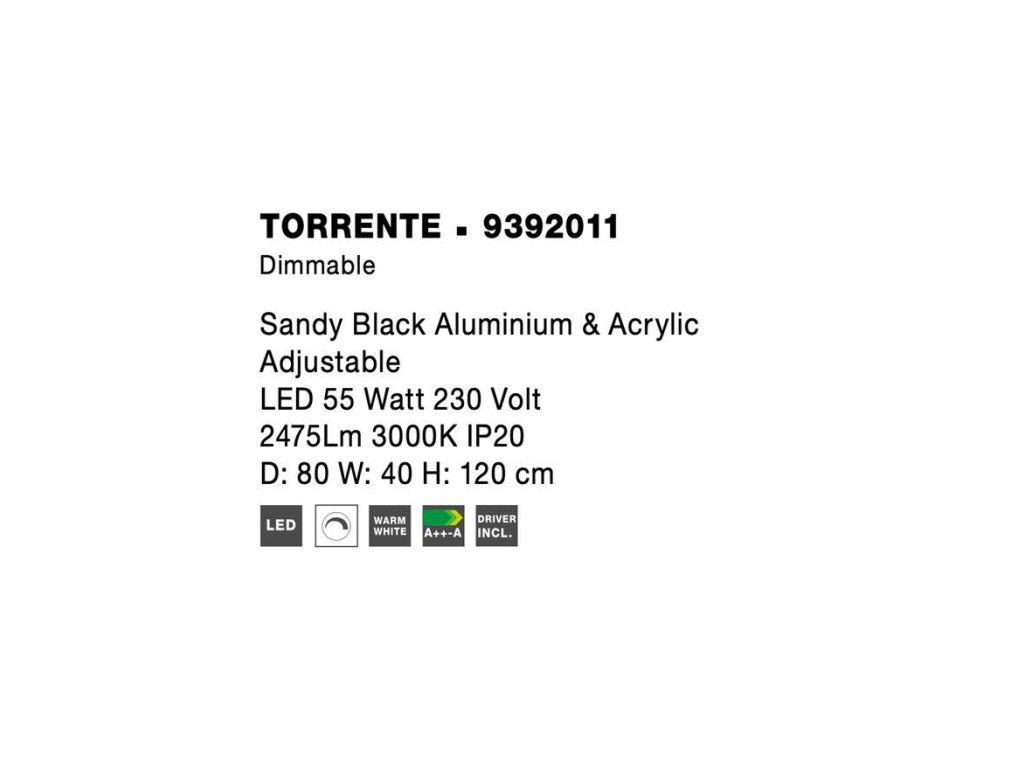 Závěsné svítidlo TORRENTE, 55W je k dispozici v černé barvě. Svítidlo je vyrobeno z hliníku a akrylu. Rozměry svítidla jsou 80x120 cm. Integrovaný LED zdroj vydává teplé bílé světlo (3000K). Svítivost zdroje je 2475 lumenů a je stmívatelný systémem TRIAC. Svítidlo doporučujeme nad jídelní stůl, do obývacího pokoje nebo ložnice.