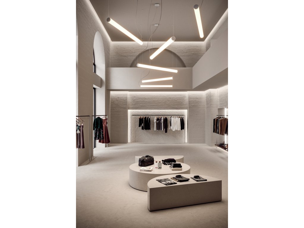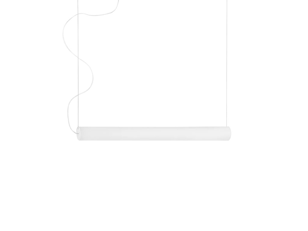 Designové závěsné LED svítidlo Tu-O dostupné v různých délkách. Tuto trubkovou lampu lze sestavit do vertikálních kaskád nebo složitých stropních světelných kompozic, čímž vytváří jedinečnou světelnou sochu. Difuzér z PMMA, koncové krytky z bílého texturovaného lakovaného hliníku. Každou trubkovou lampu lze přizpůsobit pomocí sady Comfort Cover Kit, prodávané samostatně, z černého lakovaného kovu s vrásčitým povrchem.
