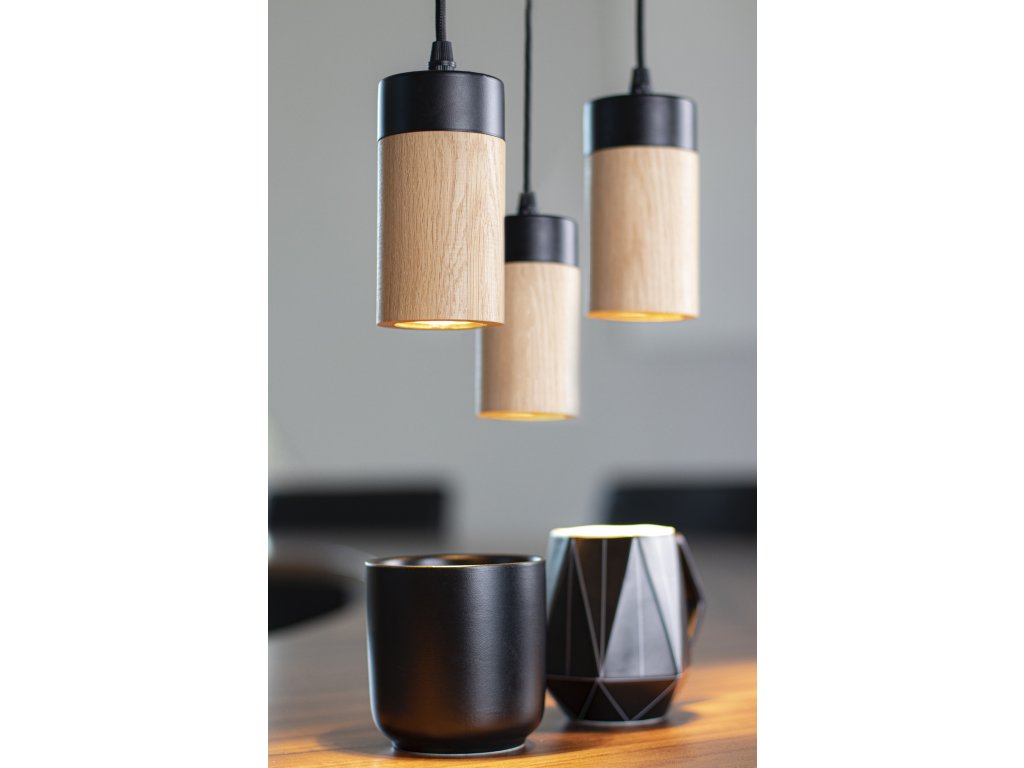 Kombinace černého kovu a dubového dřeva v olejovaném provedení, se třemi světelnými body, dodává tomuto svítidlu luxusní a nadčasový vzhled.