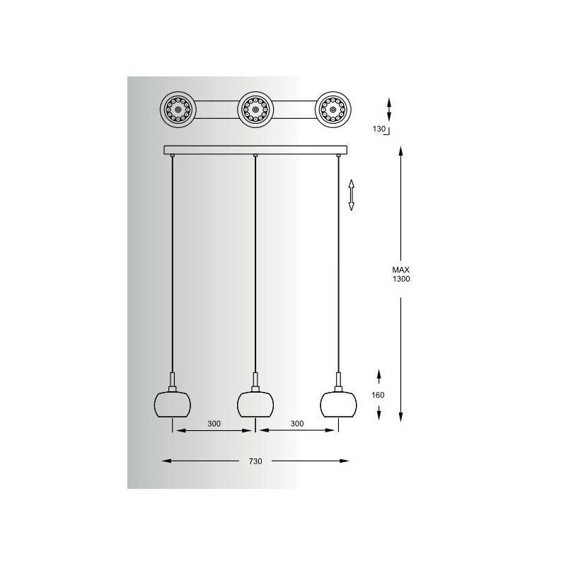 - luxusní závěsné LED svítidlo je tvořeno chromovaným obdélníkovým podhledem na kterém jsou namontována tři průhledná stínidla na dlouhých šňůrách stejné délky (maximální délka 130 cm)