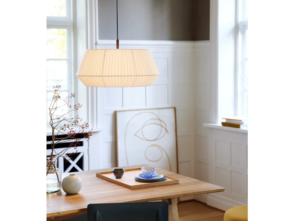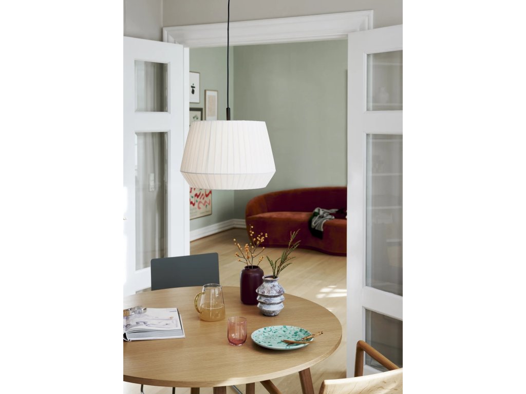 Plisované bavlněné stínidlo, které je uchyceno na kovové černé základně, zajišťuje měkké a rozptýlené světlo, které je ideální k osvětlení vašeho jídelního stolu. Svítidlo je dostupné ve dvou barevných provedeních - bílá a béžová.