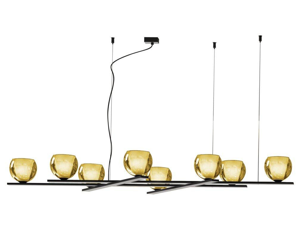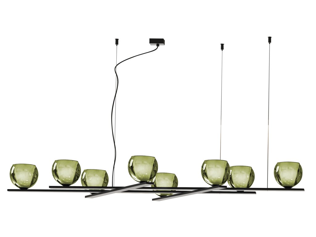 Elegantní závěsné svítidlo EMY, délka 100 cm, s osmi skleněnými difuzory v sedmi barevných provedeních - transparentní, kouřová, měděná, petrolejová, jantarová, zelená, hnědá.
