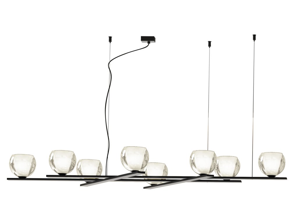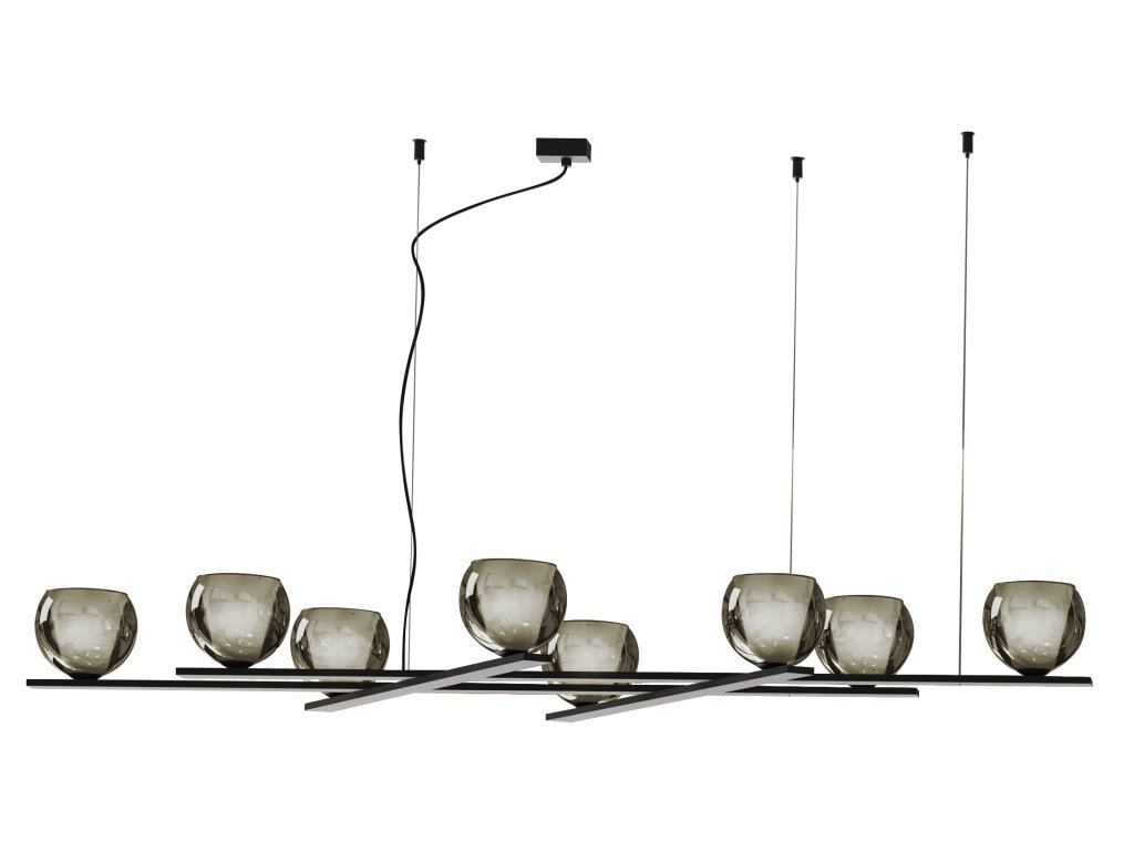 Elegantní závěsné svítidlo EMY, délka 150 cm, s osmi skleněnými difuzory v sedmi barevných provedeních - transparentní, kouřová, měděná, petrolejová, jantarová, zelená, hnědá.