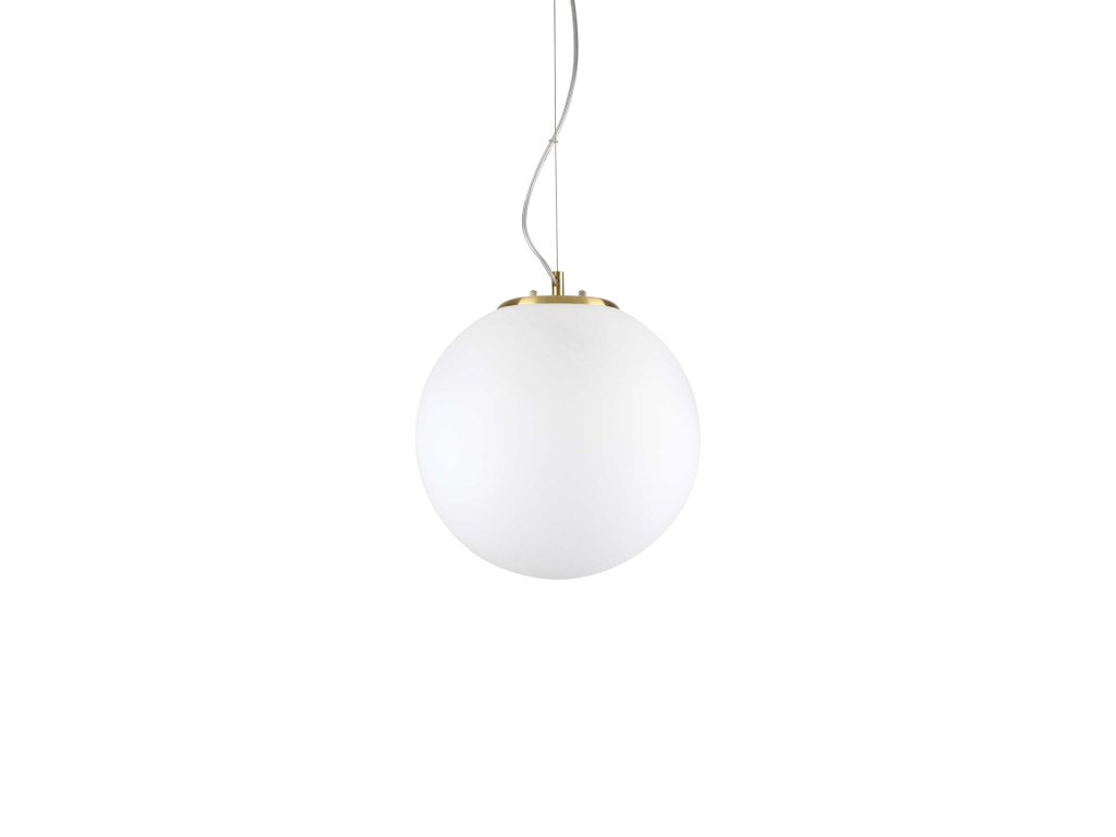 Závěsné svítidlo Grape SP1 Small z kolekce dekorativního osvětlení italské značky Ideal Lux v menším provedení o průměru 28 cm vynikne svým čistým a jednoduchým designem v moderně zařízených interiérech. Je vhodné pro osvícení jídelních koutů a obývacích místností. Jeho kulatá základna o průměru 9 cm a rám svítidla jsou vyrobeny z kovu se saténově mosaznou povrchovou úpravou. Přívodní kabel je potažen látkou. Závěsné lanko je možné výškově nastavit od 37 cm do 246 cm délky. Bílý kulatý difuzor o výšce 31 cm z foukaného skla, zdobený reliéfy ve tvaru jemných proužků, je osazen paticí E27 o maximálním příkonu 1 x 60 W. Zdroj není součástí balení, dodavatel doporučuje použít LED žárovku s příkonem 8W, svítivostí 810lm a teplotou chromatičnosti 3000K (neutrální žluté světlo). Její výhodou je nízká spotřeba elektrické energie a dlouhá doba životnosti až 15 000 hodin. Krytí IP20 je vhodné pro vnitřní montáž.Doplňkové parametry