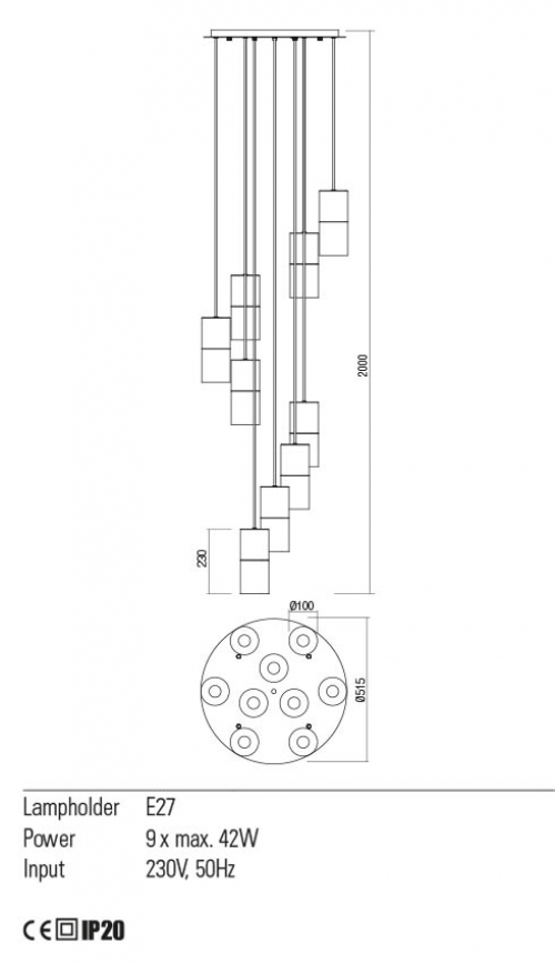 - konstrukce svítidla je z hliníku a tvoří ji 9 zavěšených žárovek připomínajících hřejivou svíčku