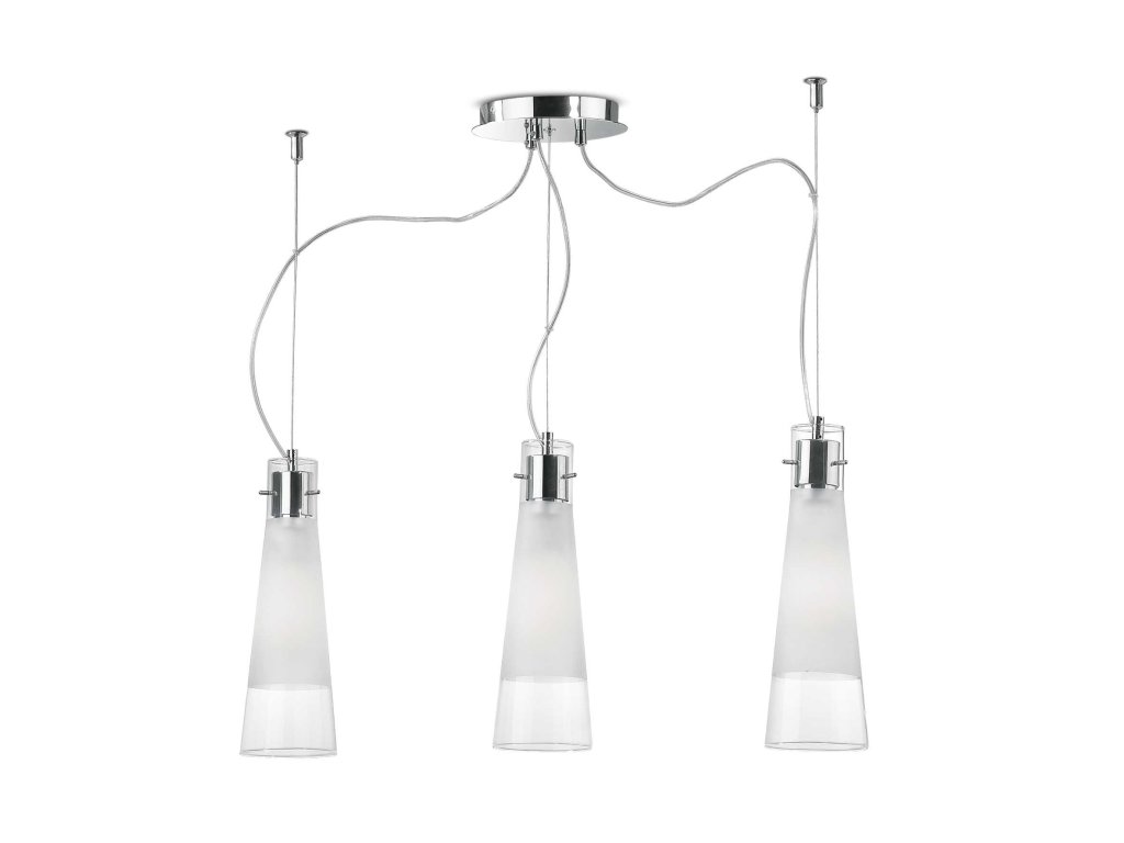 Závěsný lustr Kuky značky Ideal Lux v moderním provedení s kulatou základnou o průměru 16 cm a třemi difuzory nabídne ideální osvětlení obývacího pokoje, jídelny či kuchyně. Skvěle se bude vyjímat nad jídelním stolem. Rám světla je kovový s chromovou povrchovou úpravou. Tři čirá skleněná stínidla jsou uprostřed tvořena matně broušeným pyrexovým dílem. Výšku zavěšení lustru lze flexibilně nastavit dle potřeby při instalaci svítidla od 44 cm do 130 cm. Dva difuzory se připevňují samostatně přímo ke stropu pomocí úchytů. Svítidlo je osazeno paticemi E27 pro žárovky o maximálním příkonu 3 x 60 W. Žárovky nejsou součástí balení. Doporučujeme zvolit LED žárovky, které šetří elektrickou energii. Krytí IP20 je vhodné pro použití do interiéru. Celkové rozměry svítidla činí 130 x 67 x 20 cm. Je určeno k napájení ze sítě na 220-240 V.Doplňkové parametry