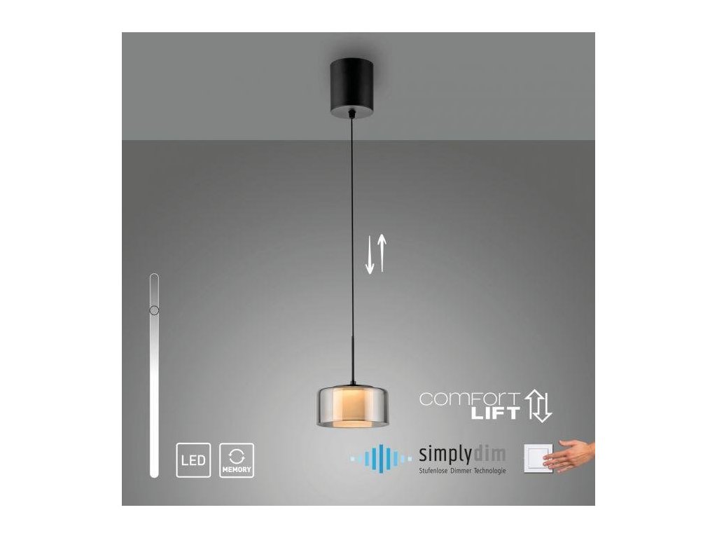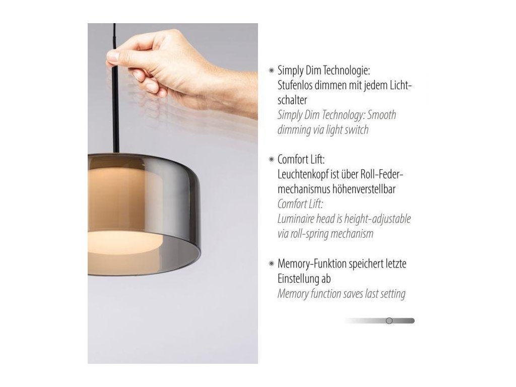 Svítidlo je vybaveno technologií SimplyDim, která umožňuje stmívání světla pomocí běžného nástěnného vypínače. Intenzitu osvětlení si tak snadno nastavíte podle aktuální nálady či situace – od jasného světla až po tlumený večerní svit. Tato elegantní závěsná lampa spojuje styl, praktičnost a moderní světelnou technologii, čímž se stává výrazným prvkem každého interiéru.