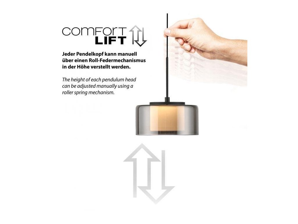 Černé LED závěsné svítidlo zaujme svým moderním, minimalistickým designem a nadčasovou elegancí. Sedm kouřových skleněných stínidel v kombinaci s teple bílými LED zdroji (3000 K) vytváří jemné, příjemné světlo, které nad jídelním stolem navozuje útulnou a přívětivou atmosféru. Díky funkci Comfort-Lift lze výšku svítidla snadno a plynule nastavit – bez potřeby nepohodlných protizávaží. Každé jednotlivé závěsné těleso lze navíc upravit samostatně, takže si můžete vzhled lampy i výšku přizpůsobit přesně podle svých představ.