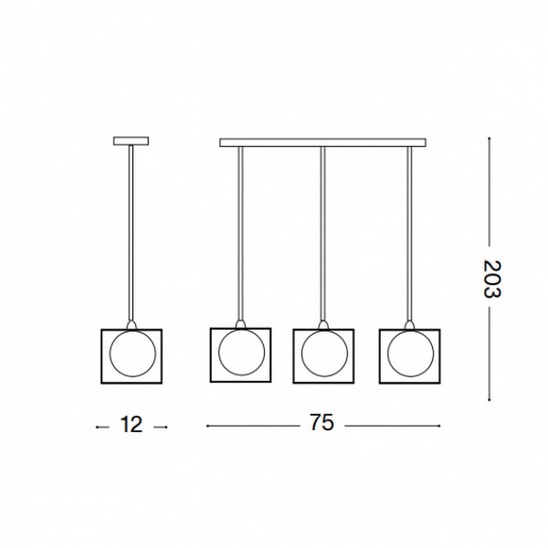 - originální závěsný lustr tvoří lakovaná kovová stropní základna o rozměrech 60 x 6 cm s matně černou povrchovou úpravou a kovovou konstrukcí složenou ze tří krychlí v barvě matné mosazi o délce jedné strany 12 cm, uvnitř které jsou umístěny kulaté difuzory z foukaného leptaného bílého skla