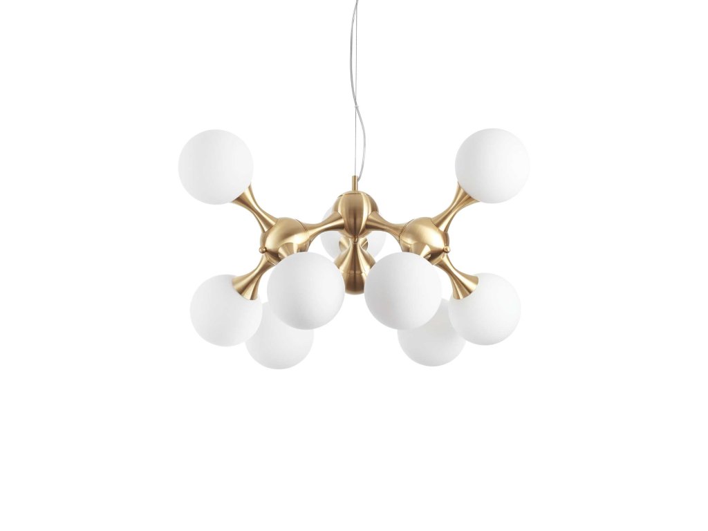 Zajímavé závěsné svítidlo Nodi z kolekce designového osvětlení značky Ideal Lux v matné mosazné barvě vhodné jako hlavní světlo do jídelny, kuchyně či obývacího pokoje. Svítidlo tvoří kulatá základna a tvarované tělo s devíti rameny, které jsou zhotoveny z kvalitního kovu. Na konci každého ramene jsou umístěny kulaté bílé difuzory z foukaného skla leptaného kyselinou, které jsou osazeny paticemi E14 pro žárovky o maximálním příkonu 9 x 40 W. Zdroje nejsou součástí balení. Doporučujeme zvolit LED žárovky pro úsporu elektrické energie. Krytí IP20 je vhodné pro použití do interiéru. Celkové rozměry svítidla činí 262 x 80 x 80 cm. Výšku závěsu je možné regulovat od 53 do 262 cm. Svítidlo je určeno k napájení ze sítě na 220-240 V.Doplňkové parametry