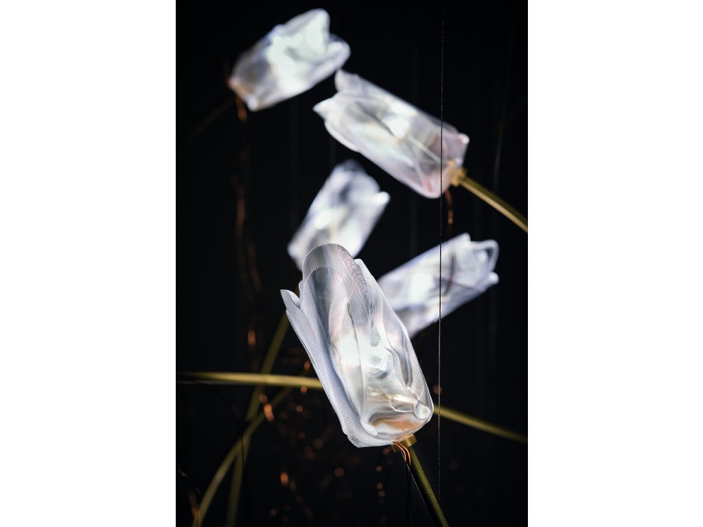- svítidlo tvoří téměř neviditelná lanka připevněná k obdélníkové rozetě (kartáčovaná mosaz), která drží zavěšené květy rozkvétajících na stoncích z kartáčované mosazi a každý květ je umístěn ve specifických úhlech