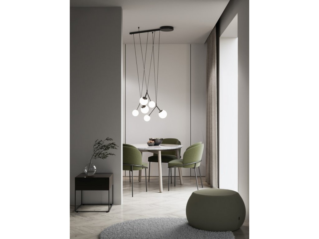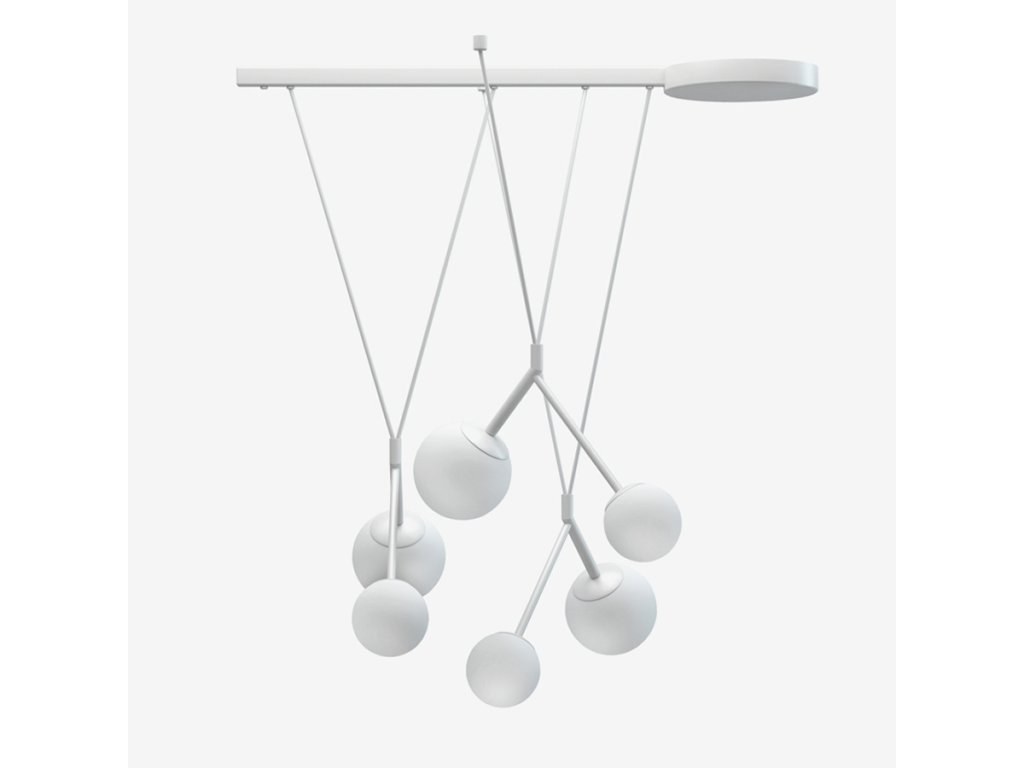 Závěsné svítidlo ZED vyrobené z ručně foukaného trojvrstvého skla v matně opálovém provedení a s ocelovým rámem lakovaným bílou nebo černou barvou. Bílý nebo černý kabel jako závěs. Rozměry svítidla jsou d105xš57xv113 cm. Průměr stínidel činí 15 a 11,5 cm. Svítidlo se skvěle hodí do obývacího pokoje, ložnice, do chodby nebo do kancelářských prostor.