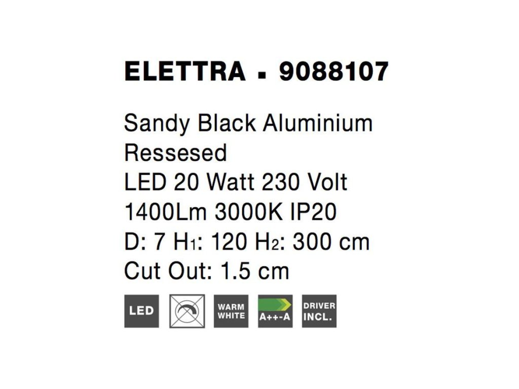 Závěsné svítidlo ELETTRA, 20W je k dispozici v černé barvě. Svítidlo je vyrobeno z hliníku. Rozměry svítidla jsou 9x300 cm. Integrovaný LED zdroj vydává teplé bílé světlo (3000K). Svítivost zdroje je 1400 lumenů a je nestmívatelný. Svítidlo doporučujeme do obývacího pokoje, ložnice nebo pracovny.
